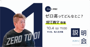 「堀江貴文参加の学校説明会」[10月4日] 10月4日ゼロ高等学院 オンライン説明会を開催します。 本説明会では、ゼロ高主宰 堀江貴文が登壇します。ゼロ高をつくった理由や、これからチャレンジする中学生・高校生に向けて、A … 続きを読む 「堀江貴文参加の学校説明会」[10月4日]